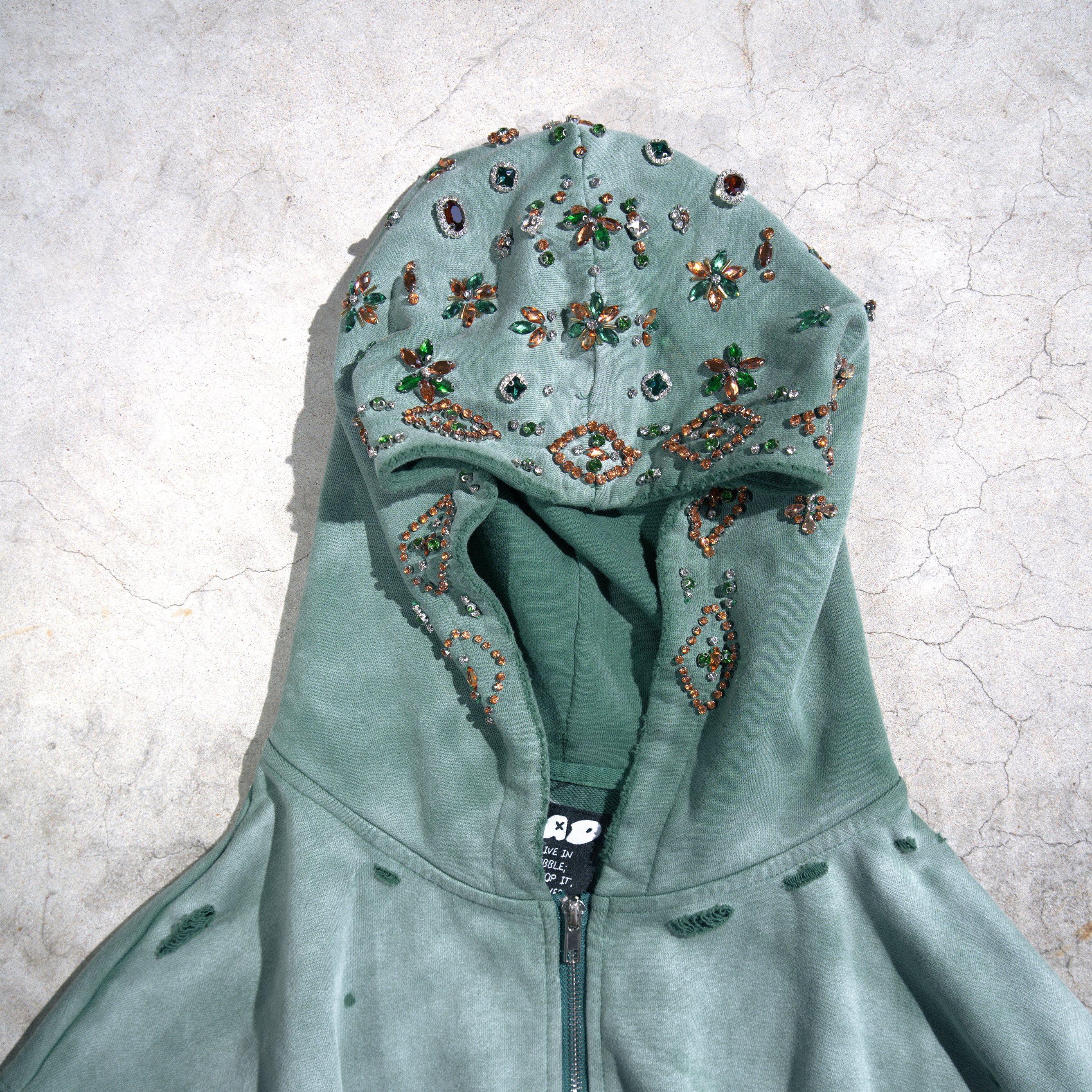- HAND SEWN GEMS ON HOOD